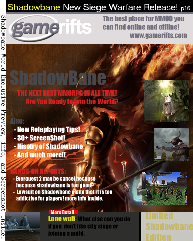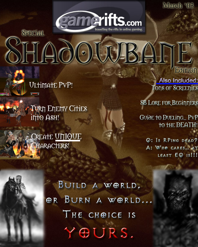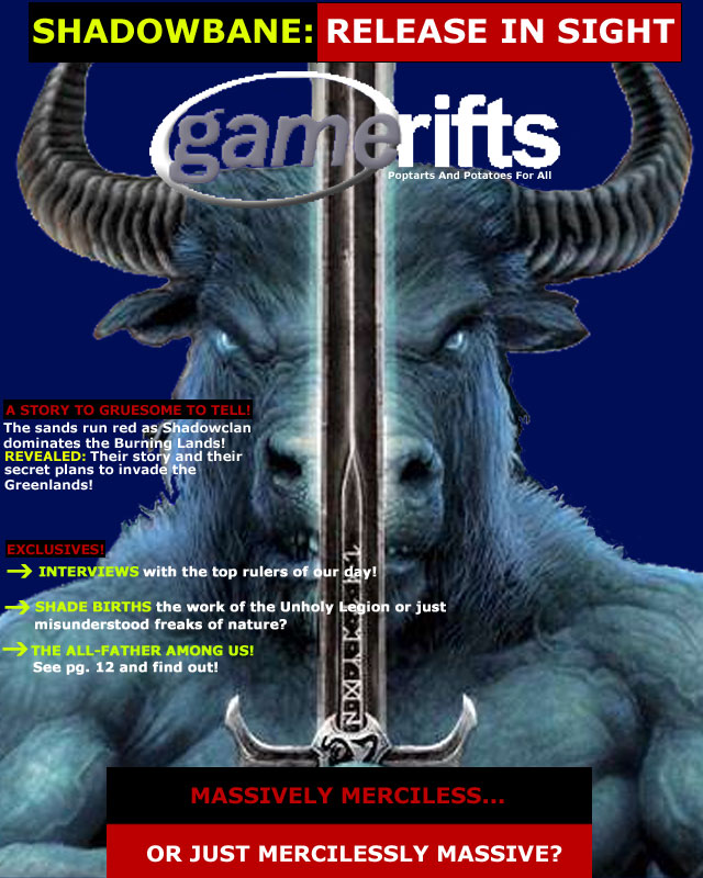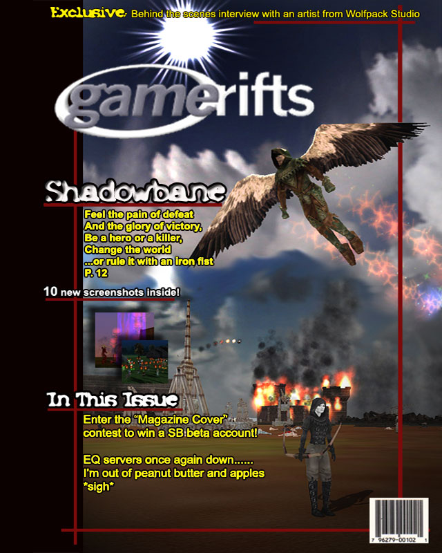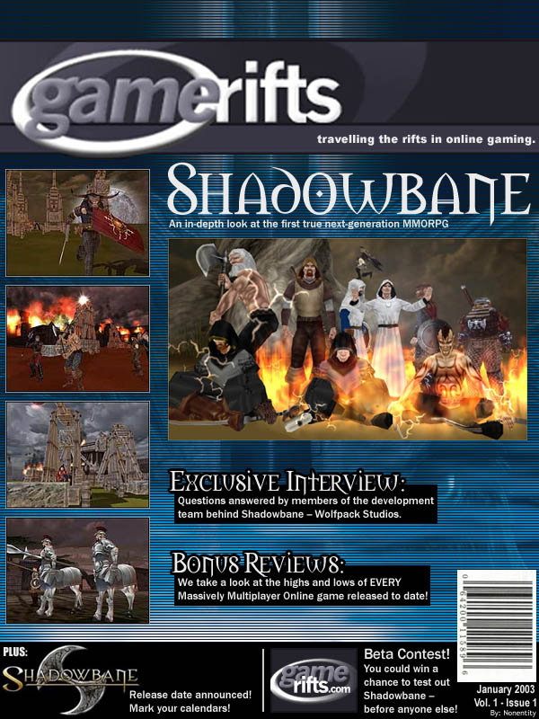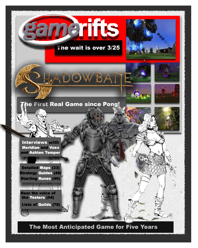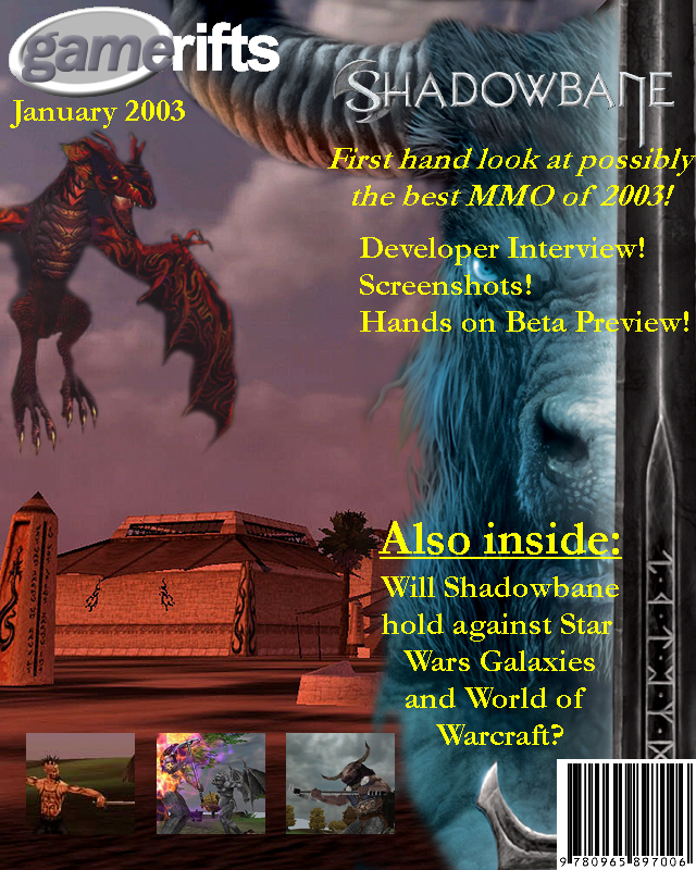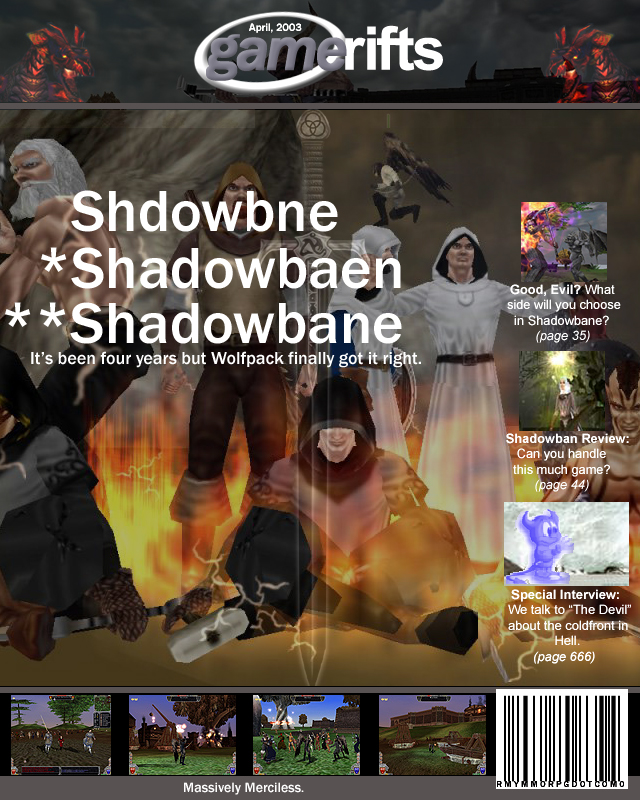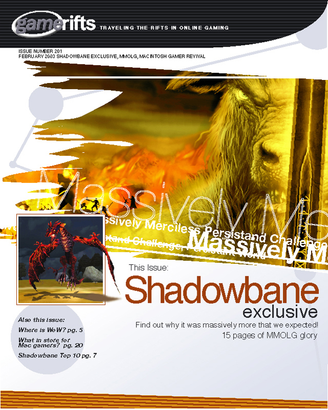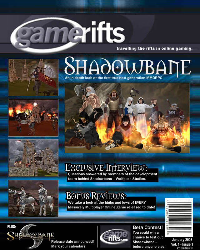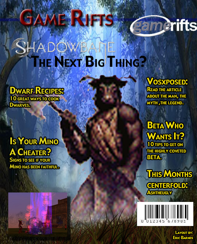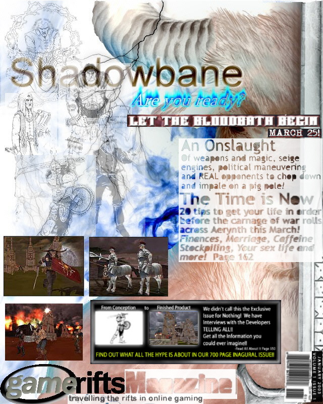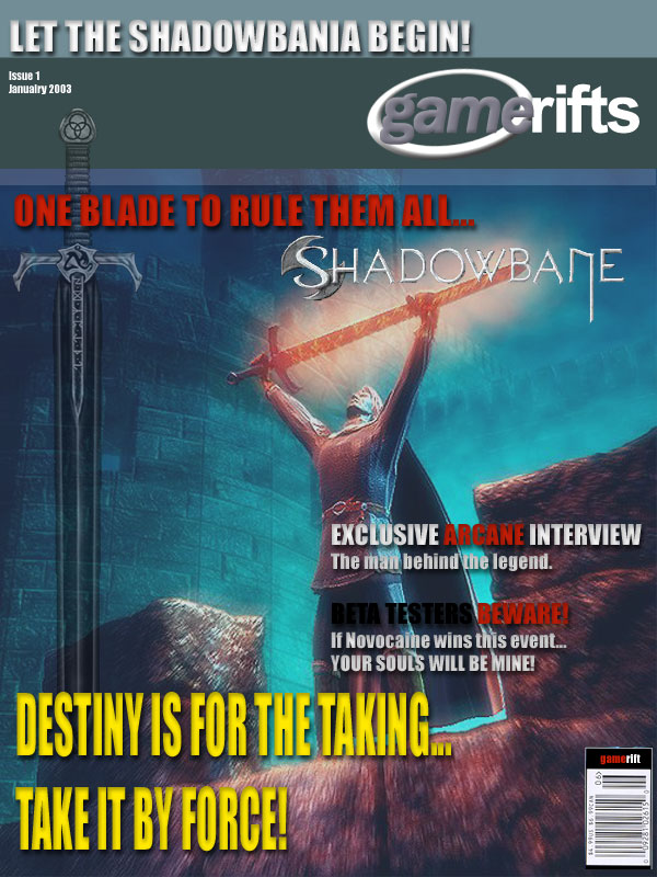We’ve always wondered what this site would look like, if we were to shut-down and convert it to a monthly magazine dedicated to massively-multiplayer online games, kind of like MOG Magazine. Thanks to Valkyrie of SBSanctum we found out when she launched a community contest for the Shadowbane fans in which they put to use their artistic talents and designed a cover dedicated to the release of one of the most anxiously awaited MMO games to be in development. We even kicked in a prize, and Chris “Vosx” Mancil awarded the runner-ups not with ten beta accounts, but twenty. That rocked!