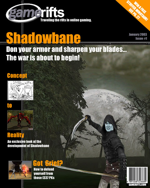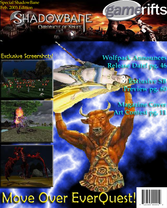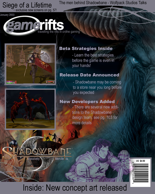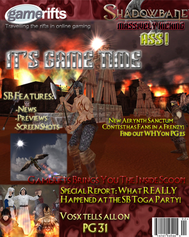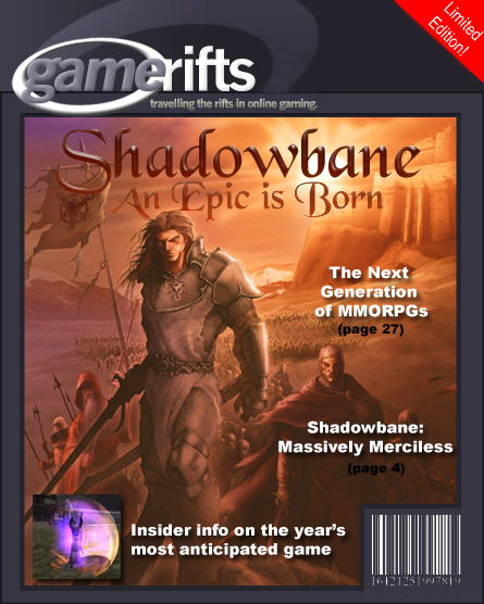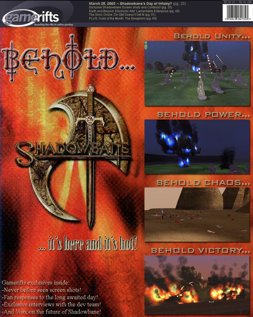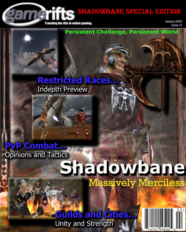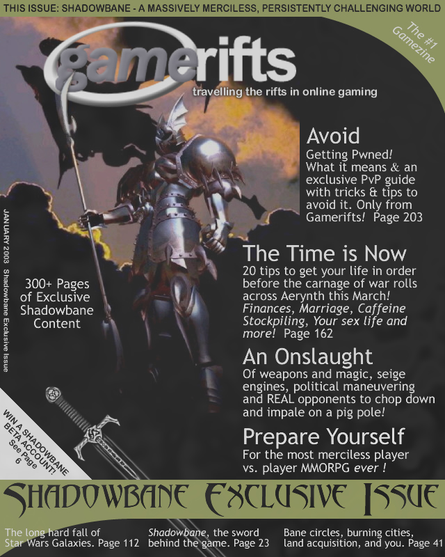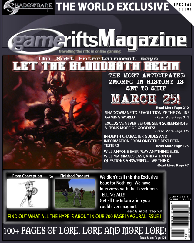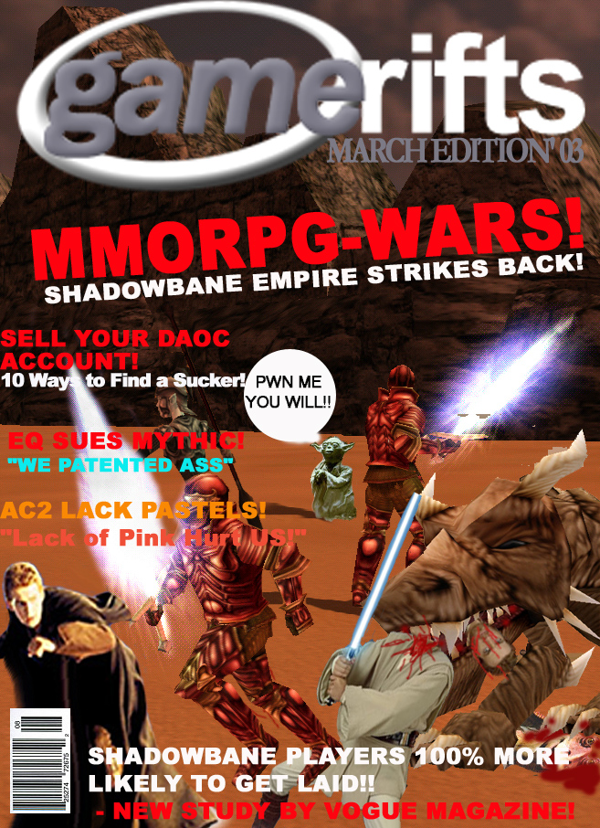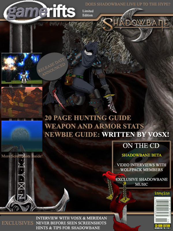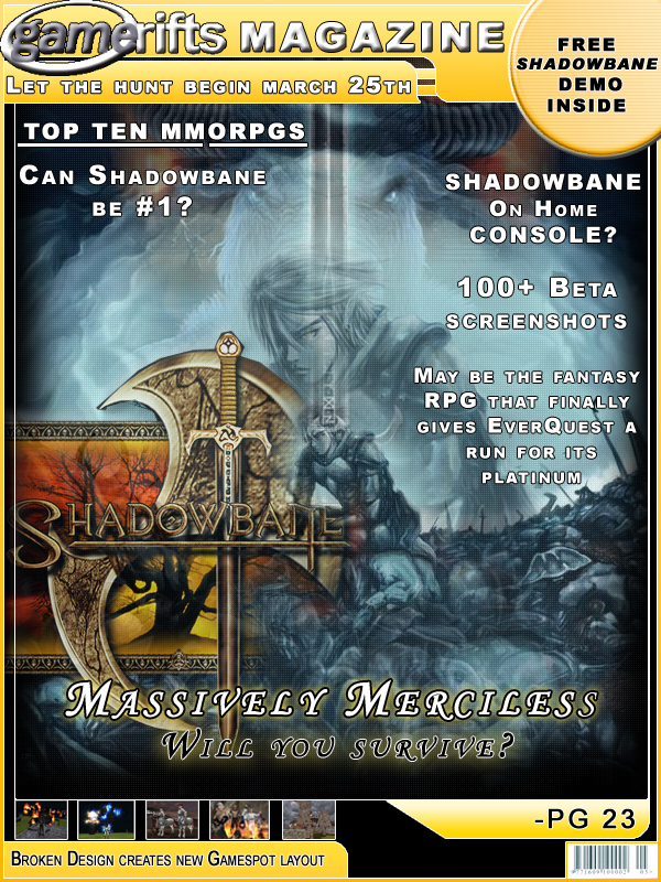 We’ve always wondered what this site would look like, if we were to shut-down and convert it to a monthly magazine dedicated to massively-multiplayer online games, kind of like MOG Magazine. Thanks to Valkyrie of SBSanctum we found out when she launched a community contest for the Shadowbane fans in which they put to use their artistic talents and designed a cover dedicated to the release of one of the most anxiously awaited MMO games to be in development. We even kicked in a prize, and Chris “Vosx” Mancil awarded the runner-ups not with ten beta accounts, but twenty. That rocked!